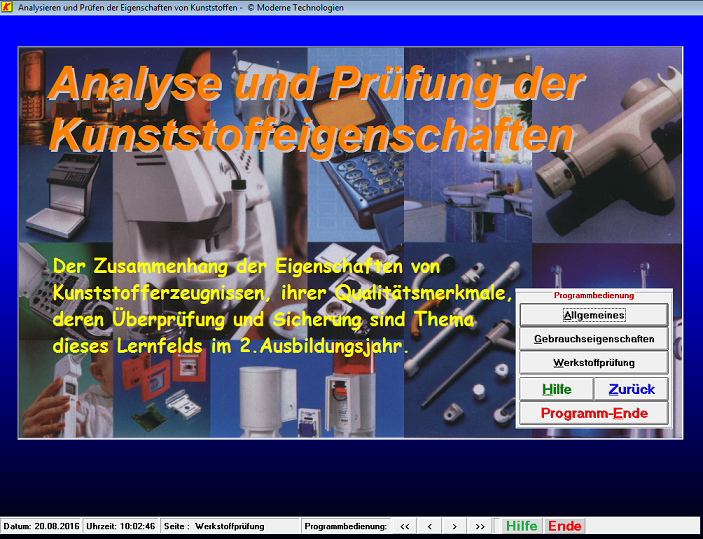 Der Aufbau dieses Programmteils geht aus der abgebildeten Menüleiste hervor: Allgemeines Dieser Programmpunkt ist eine kurze Einleitung in das Gebiet der Werkstoffprüfung. Gebrauchseigenschaften Mit Hilfe von Gebrauchwertprüfungen werden Untersuchungen z.B. zur Lebensdauer von Produkten durchgeführt. Werkstoffprüfung Die Lektion, die die eigentliche Werkstoffprüfung zeigt, ist aus den Prüfungsgebieten 1. Kurzzeitversuche: Zug-, Biege-, Druck-, Härteprüfung-, Schlagzähigkeits- und Durchstoßversuch Weiterreiß-, Trenn-, Abzugs- und Scherversuch Dichte, Schüttdichte, Stopfdichte, Rieselfähigkeit, Feuchtigkeitsmessung Viskostät, Schmelzindex, Wärme-Formbeständigkeit, Brennbarkeit 2. Langzeitversuche: Zeitstandsversuch, Dauerschwingversuch 3. Langzeitverhalten von Kunststoffen: Chemikalien- und Wetterbeständigkeit, Langzeitwärmeeinwirkung, Spannungsrißbildung 4. Brennbarkeitsuntersuchungen: Brennbarkeitsversuche 5. Elektrische Versuche: Spannungsfestigkeit, 6. Optische Prüfverfahren: Graumaßstab- und Glanzzahlbestimmung, Transmissions-, Trübungs- und Gelbwertmessung, Farbmessung, Bildanalyse |